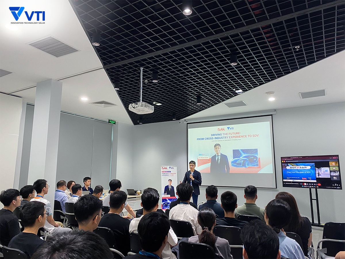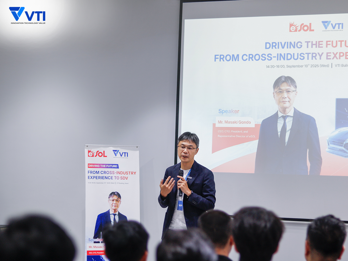Ngày 10/9/2025, tại trụ sở chính VTI Building, ông Masaki Gondo – CEO, CTO, Chủ tịch & Giám đốc đại diện của eSOL, công ty công nghệ hàng đầu Nhật Bản trong lĩnh vực phần mềm ô tô – đã mang đến những chia sẻ chuyên sâu tại hội thảo “Driving the Future: From Cross-Industry Experience to SDV” (Lái xe tương lai: Từ trải nghiệm xuyên ngành đến SDV).